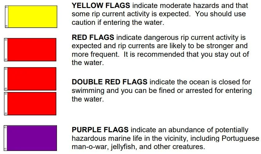 The Town flies these flags at both Regional Beach Access facilities (which are served by lifeguards in the summer months), and on all Town beach patrol vehicles patrolling and providing services on the beach strand. Please look for these warning flags on our beaches and know what they mean, so that you can avoid hazards and have a safe and enjoyable beach experience in Emerald Isle.